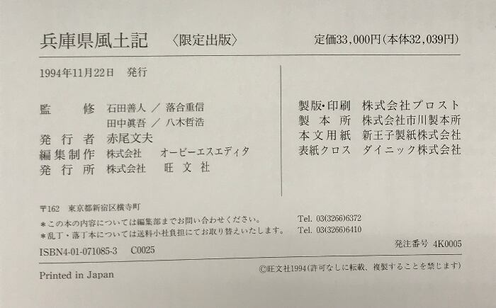 タイトル:兵庫県風土記(限定出版)発行:旺文社 監修:石田善人・落合重信 他 1994年