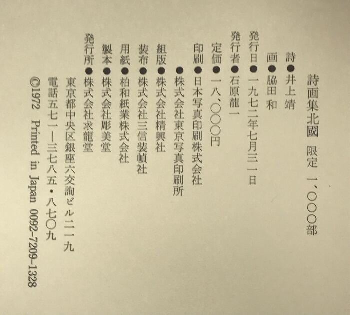 タイトル:詩画集 北国 詩:井上靖 画:脇田和 限定1000部 発行:求龍堂版 1972年