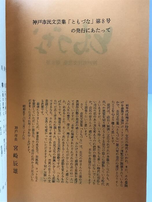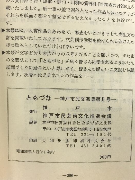 タイトル:ともづな-神戸市民文芸集-(第8号)編発行:神戸市市民芸術文化推進会議 昭和56年