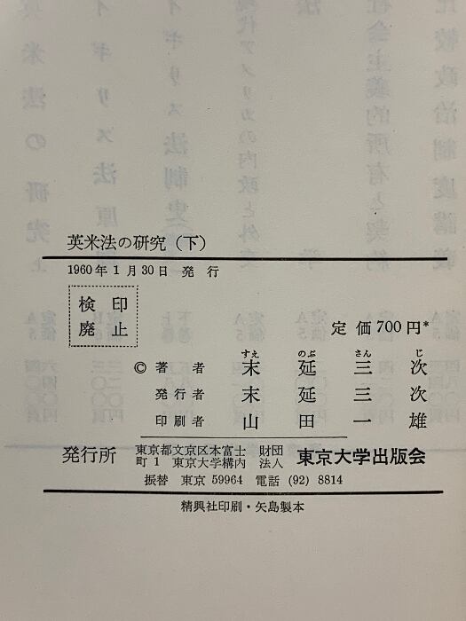 英米法の研究〈下〉 (1960年) 東京大学出版会 末延 三次