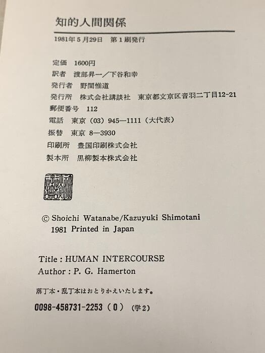 知的人間関係 講談社 P.G.ハマトン 渡部昇一 下谷和幸