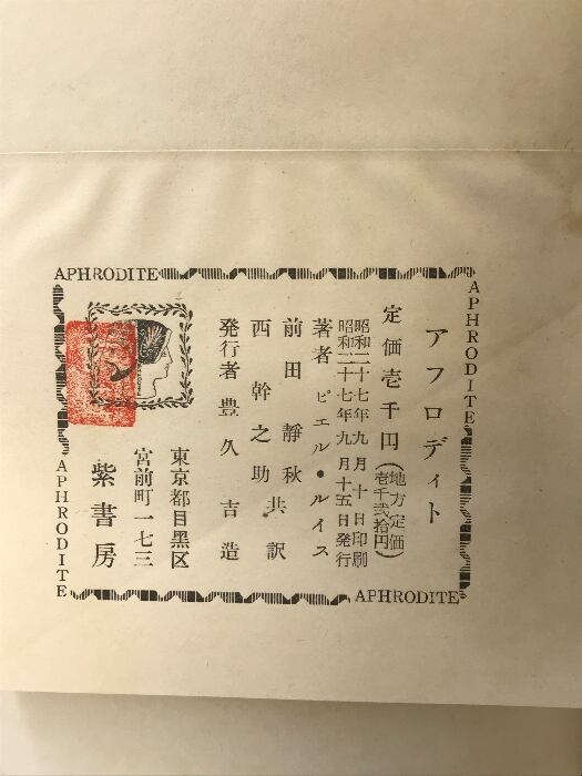タイトル:アフロディト「限定版500部之内第468番」 発行:紫書房版 著:ピエル・ルイス 訳:前田静秋 他 昭和27年