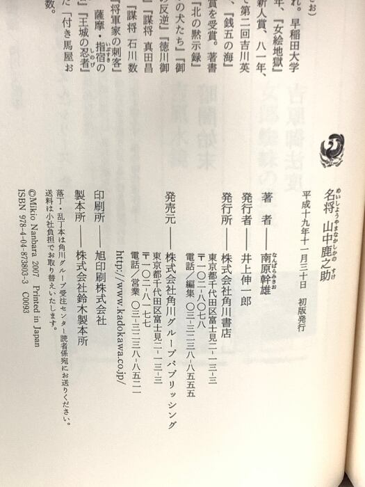 タイトル:名将山中鹿之助 角川書店 南原 幹雄