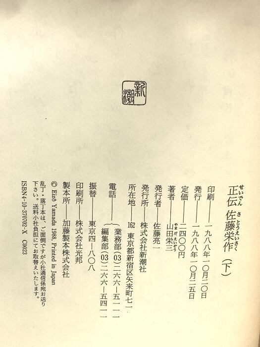 タイトル:正伝 佐藤栄作 下 新潮社 山田 栄三