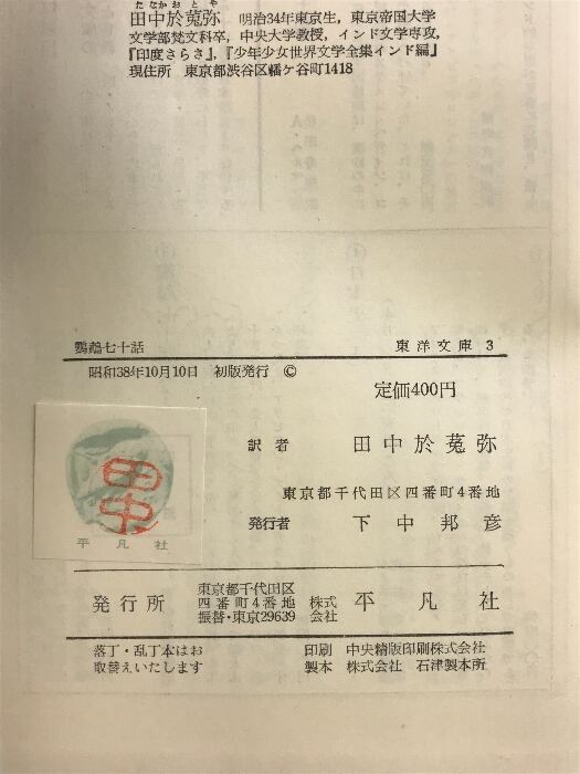 タイトル:鸚鵡七十話―インド風流譚 (東洋文庫〈3〉) 東洋文庫 訳:田中於莬弥
