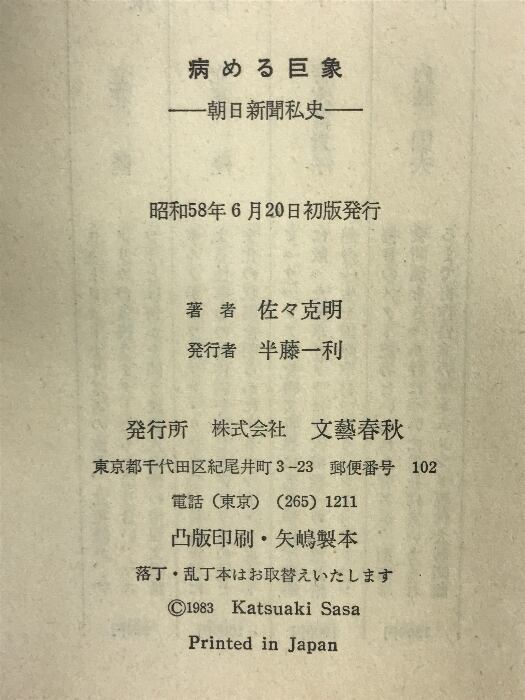 タイトル:病める巨象―朝日新聞私史 文藝春秋 超:佐々克明