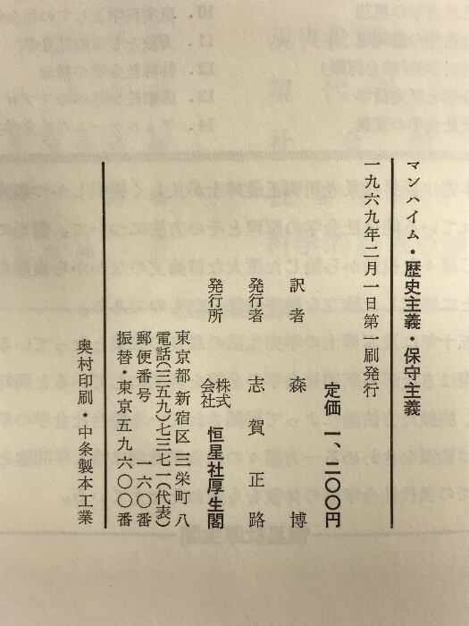タイトル:歴史主義・保守主義 恒星社厚生閣 著:マンハイム 訳:森博 1969年