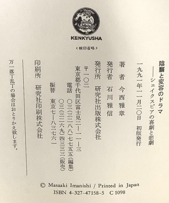 タイトル:陰翳と変容のドラマ: シェイクスピアの喜劇と悲劇 研究社 今西 雅章
