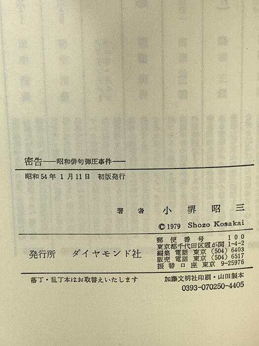 タイトル:密告 昭和俳句弾圧事件 (1979年) ダイヤモンド社 小堺 昭三