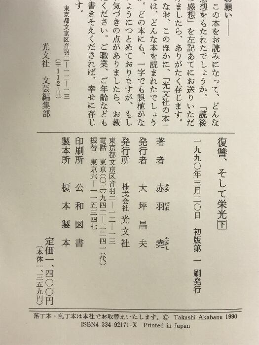 タイトル:復讐、そして栄光 (下) 光文社 赤羽 尭