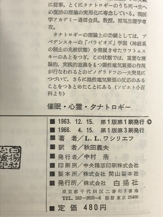 タイトル:催眠・心霊・タナトロギー―超心理の探究 白揚社 著:エリ・ワシリエフ 訳:秋田義夫