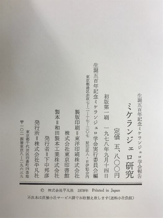 タイトル:ミケランジェロ研究(初版) 生誕五百年記念ミケランジェロ学会報告 平凡社 (1978年)