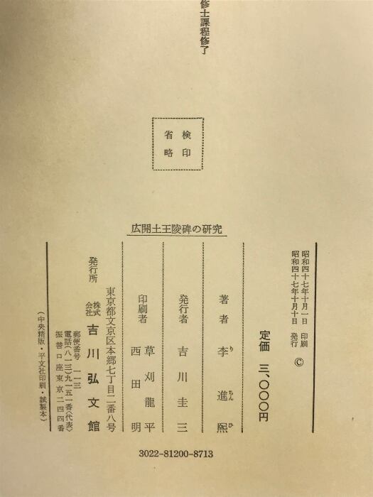 タイトル:広開土王陵碑の研究 吉川弘文館刊行 著:李進煕