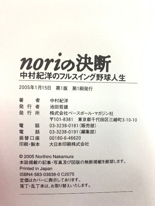 タイトル:noriの決断: 中村紀洋のフルスイング野球人生 ベースボール・マガジン社 中村 紀洋