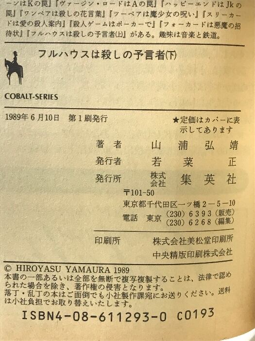 タイトル:フルハウスは殺しの予言者 下 (集英社文庫 コバルトシリーズ 113-U) 集英社 山浦 弘靖