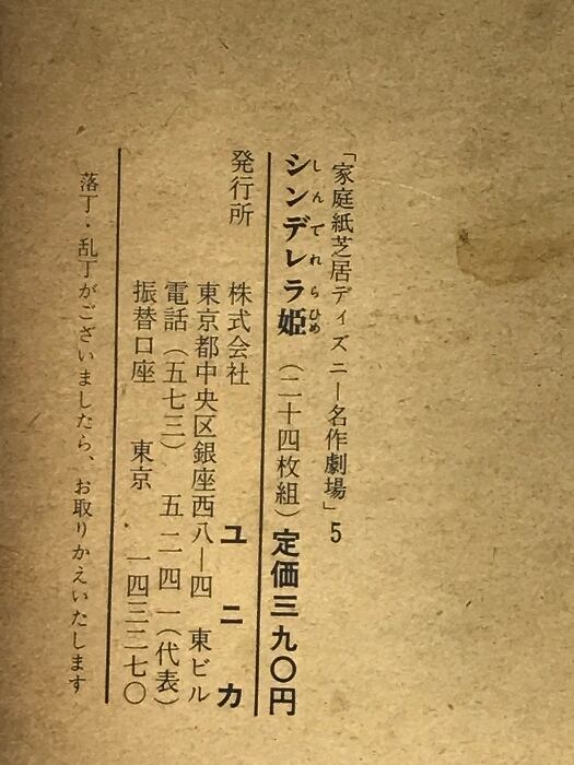 タイトル:(2)。家庭紙芝居(24枚組)「ディズニー名作劇場」5 シンデレラ姫 発行:ユニカ