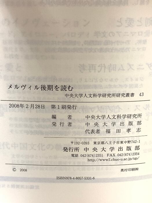 メルヴィル後期を読む (中央大学人文科学研究所研究叢書 43) 中央大学出版部 中央大学人文科学研究所
