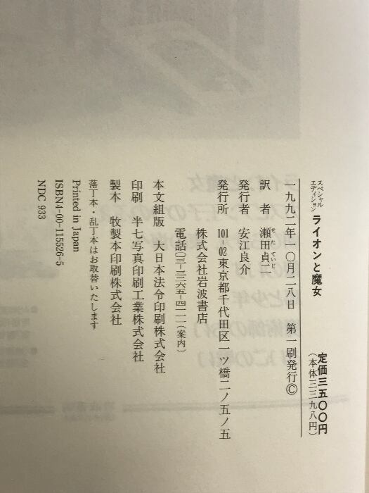 (2)ライオンと魔女 スペシャルエディション 岩波書店 C.S.ルイス:作 瀬田貞二:訳 1992年