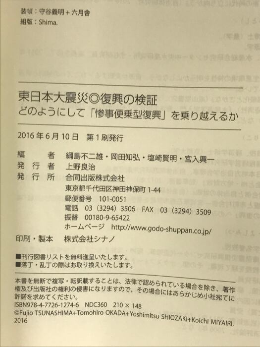 タイトル:東日本大震災 復興の検証: どのようにして「惨事便乗型復興」を乗り越えるか 合同出版 綱島不二雄