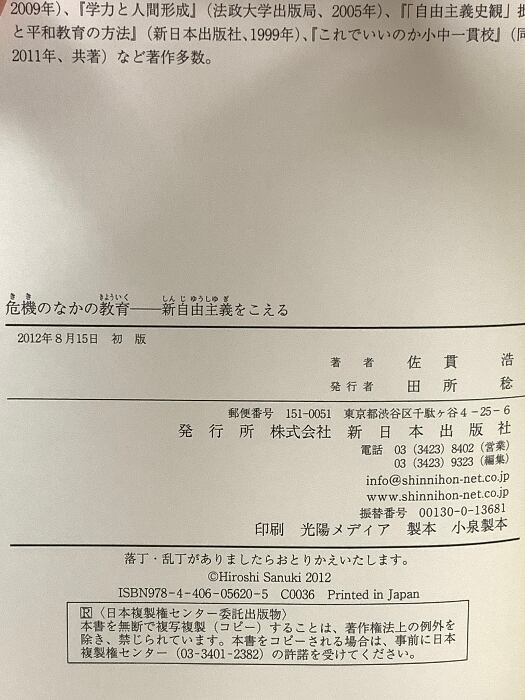 タイトル:危機のなかの教育 新自由主義をこえる 新日本出版社 佐貫 浩
