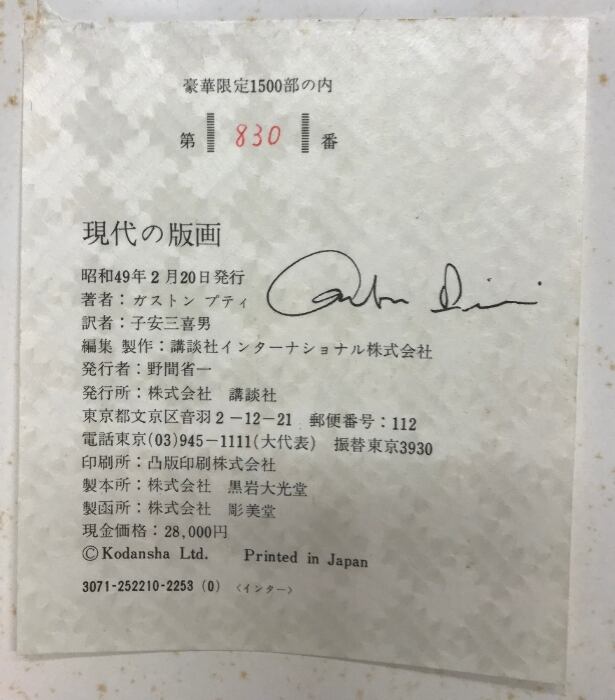 タイトル:【図録】現代の版画(限定1500部の内第830番)発行:講談社 著:ガストン・プティ 訳:子安三喜男 昭和49年