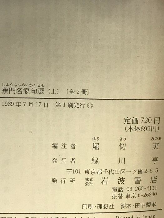 蕉門名家句選 上 (岩波文庫 黄 259-1) 岩波書店 堀切 実