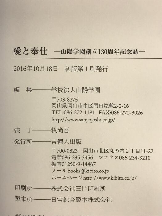 タイトル:愛と奉仕—山陽学園創立130周年記念誌— 吉備人出版 学校法人山陽学園