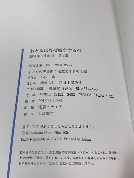 タイトル:おとなはなぜ戦争するの 新日本出版社 子どもの声を聞く児童文学者の会