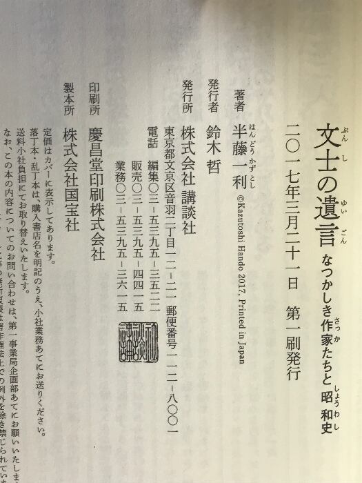 文士の遺言 なつかしき作家たちと昭和史 講談社 半藤 一利