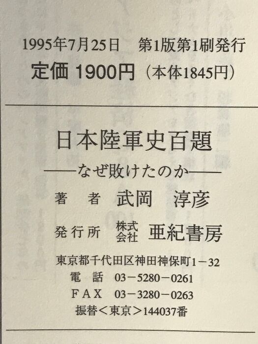 タイトル:日本陸軍史百題: なぜ負けたのか 亜紀書房 武岡 淳彦
