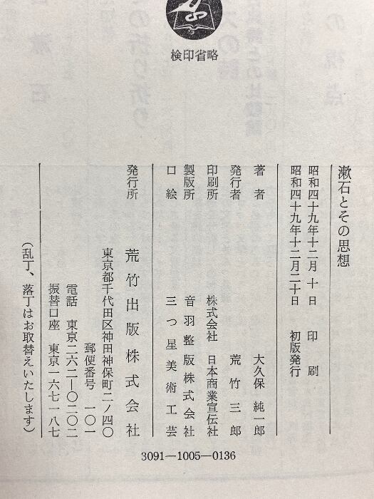 タイトル:漱石とその思想 荒竹出版 大久保 純一郎
