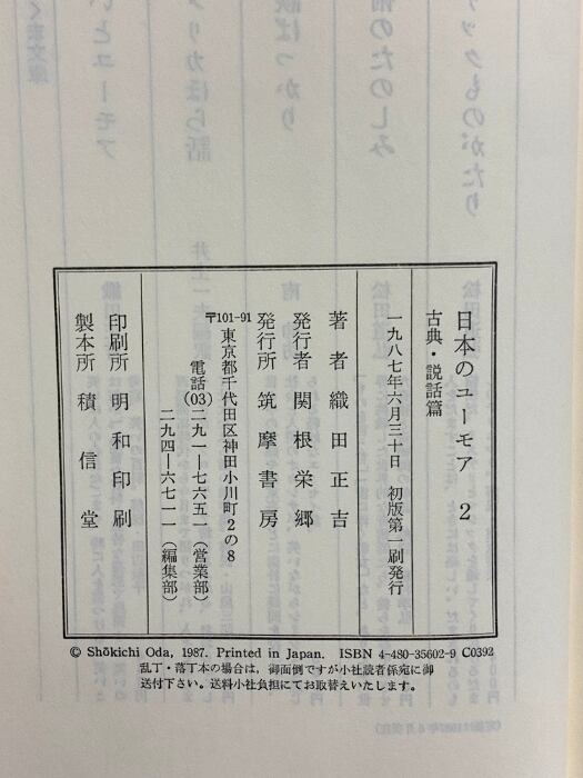 タイトル:日本のユーモア 2 古典・説話篇 筑摩書房 織田 正吉