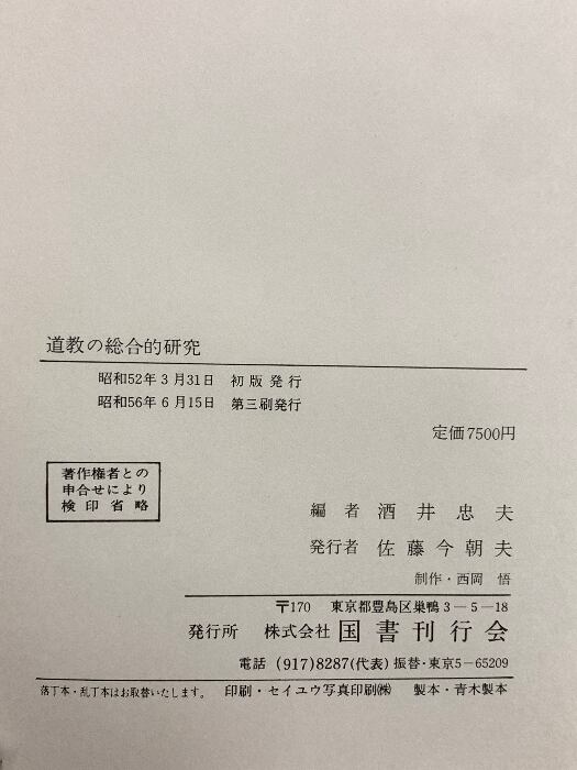 タイトル:道教の総合的研究 酒井 忠夫編 昭和56年 国書刊行会