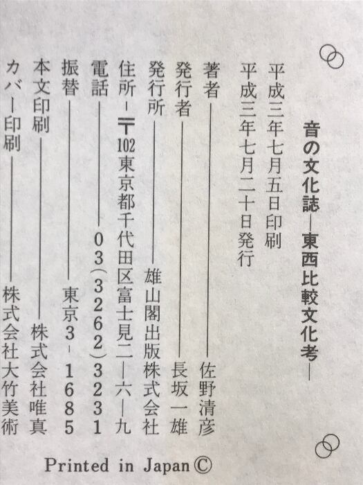 タイトル:音の文化誌: 東西比較文化考 雄山閣 佐野 清彦