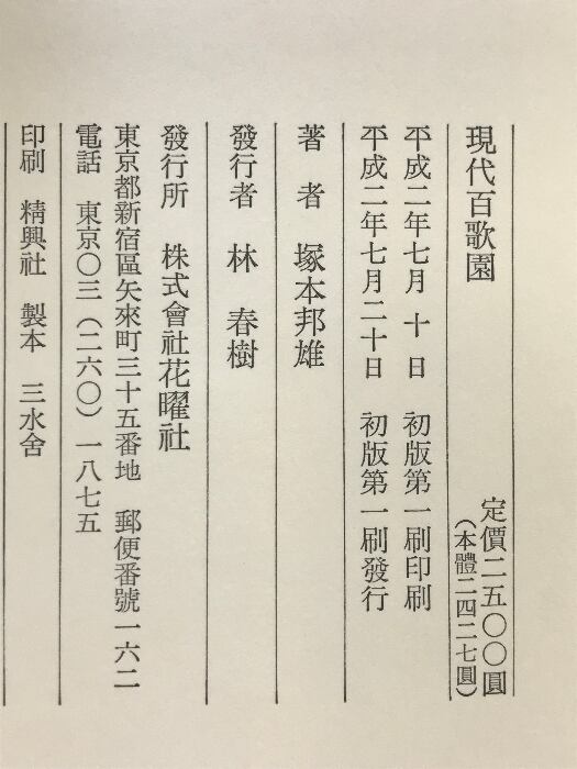 著者による「跋」より: 「昭和60年1月4日金曜日から、翌年12月19日金曜日までの二年間週一回、計百回、徳島新聞に連載」 「このたびの一冊は、現代歌人の秀作を網羅しようと努めた点、他の詞華集とはやや趣を異にするだらう。ただ、新年から始まつた連載ゆゑ、必然的に季節に順ふ配列を考へねばならず、作者の最高作と四季の一致はまことに難事で、次善を採る結果になつた例も少くない。」 「また本文は、私の主張に悖り、初出通り現代仮名遣いで統一した。新聞掲載記事は原則として、定型詩作品以外は、半ば暴力的に、現代仮名遣い・当用漢字を要求される。その違和感は、時として堪へがたいが、本書は、むしろ掲載時の不如意を蘇らせるために、敢へてもとのままにした。」