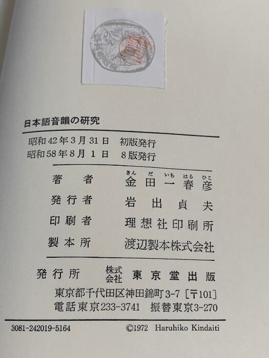 タイトル:日本語音韻の研究 金田一春彦 東京堂出版