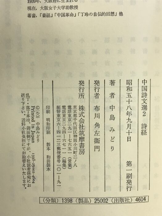 詩経 (1983年) (中国詩文選〈2〉) 筑摩書房 中島 みどり