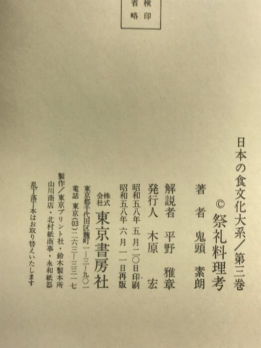 祭礼料理考 日本の食文化大系3 東京書房社版 鬼頭素朗:著 昭和58年